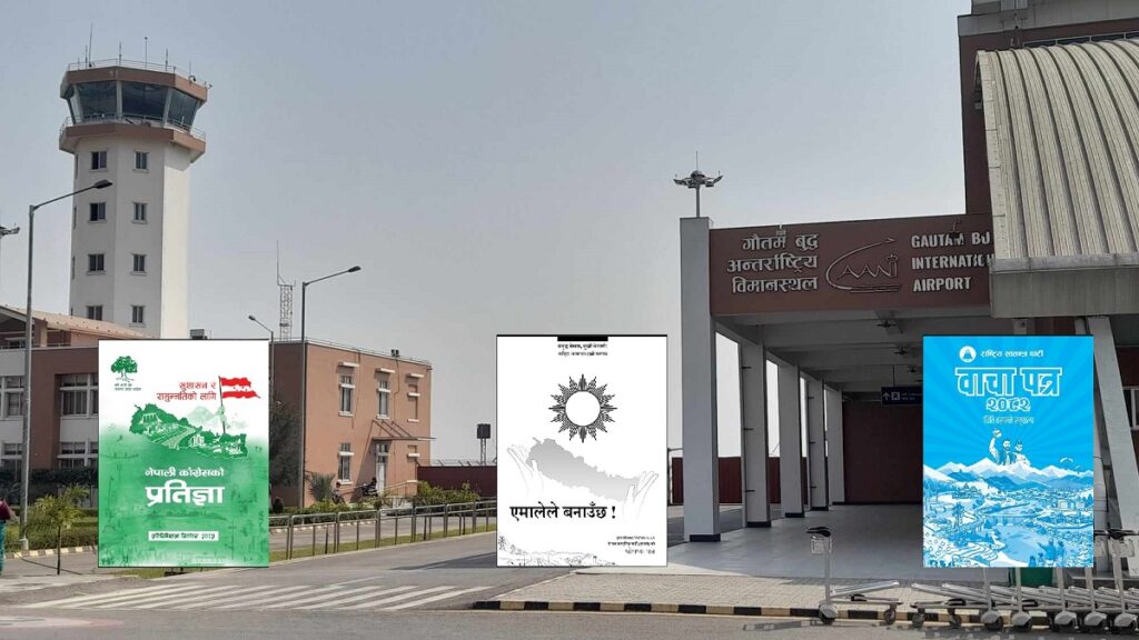 भैरहवा-आगामी फागुन २१ गते हुने प्रतिनिधि सभा निर्वाचनका लागि दलहरुले घोषणापत्र सार्वजनिक गरिसकेका छन्। घोषणपत्रमा पर्यटन र उड्यनका कुराहरु पनि समेटिएका छन्। सबैजसो दलका घोषणापत्रमा विमानस्थल र अन्तर्राष्ट्रिय उडान बारे पनि उल्लेख छ।