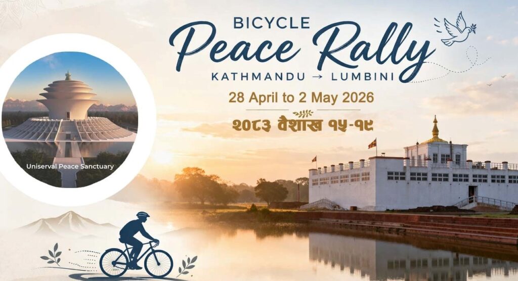 बुटवल– विश्व शान्तिको सन्देशको लागि काठमाडौंबाट लुम्बिनीसम्म साइकिल यात्रा हुने भएको छ। महासिद्ध पिस स्याङ्चुरीको आयोजनामा बैशाख १५ गतेदेखी ४ दिने शान्तिको लागि साइकिल यात्रा हुने भएको हो। यात्राका क्रममा १०८ जना साइकिलयात्री सहभागी हुने बुधबार आयोजित पत्रकार सम्मेलनमा जानकारी गराइएको थियो।